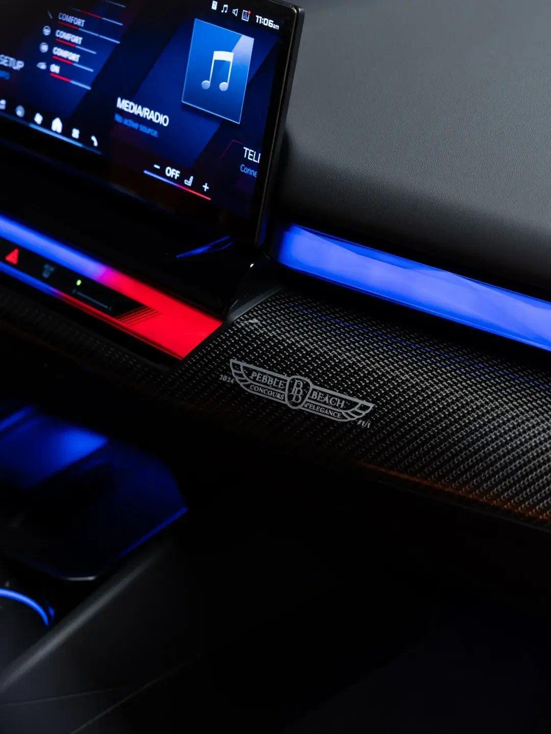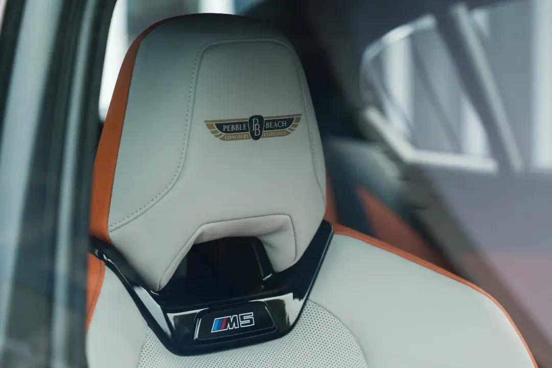内饰也在配色上作出了专属个性化定制,座椅采用卡拉米橙和银石色Merino真皮的拼接,同样也是专属的配色。前排座椅头枕和副驾驶前方也都有专属的Pebble Beach Concours d'Elegance的标识。