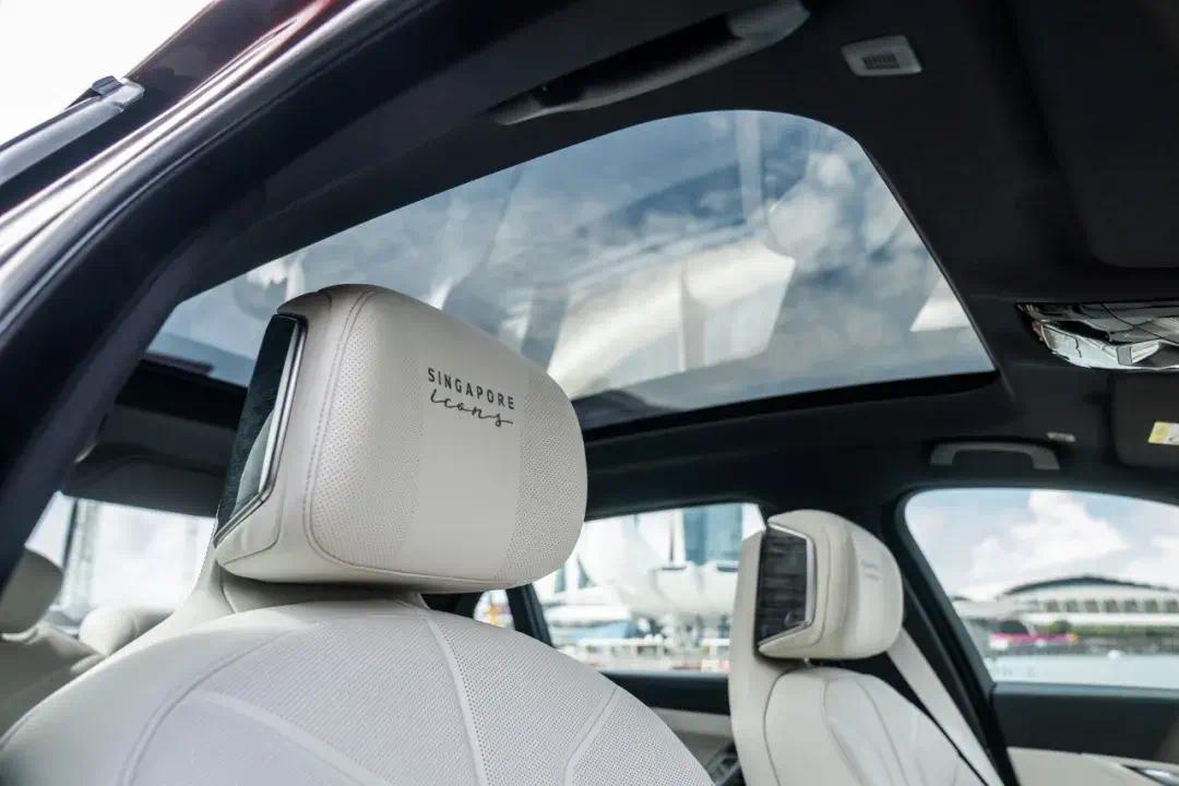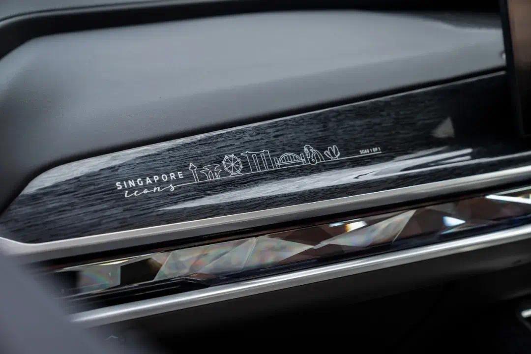 车漆颜色为马德拉红 (Madeira Red) ,源自劳斯莱斯的颜色库,车漆代码R20。轮毂为21英寸的1055型。车厢内部副驾驶前方带有专属的新加坡建筑图案,这个可就尊了哦,它是用一块宽27.5厘米、厚度不到1毫米的金属激光切割而成的。另外前后头枕处也有专属的字样。